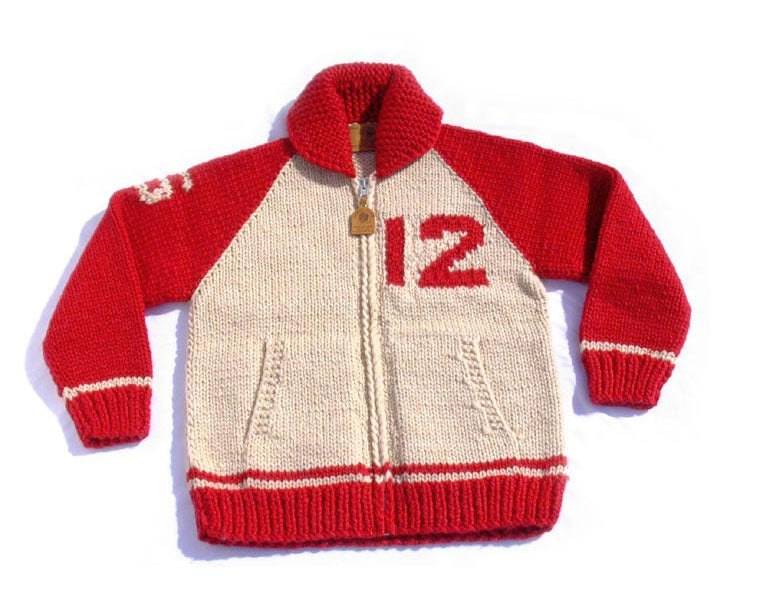 Classic sports jacket design depicting the many sports played worldwide. Select your choice of the back design. Hand knit featuring raglan sleeves and angled pockets. Canadian Sweater Company leather zipper pull and neck label, heavy-duty brass zipper.